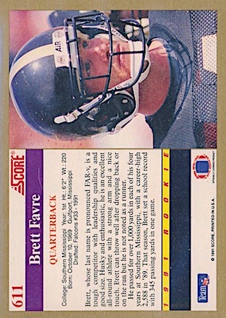 This 315 card set premiered in 1991 and was discontinued in 1992. It was split up into two series, 150 cards for series one and 165 cards for series two. Brett Favre can be found in Series 2 packs.