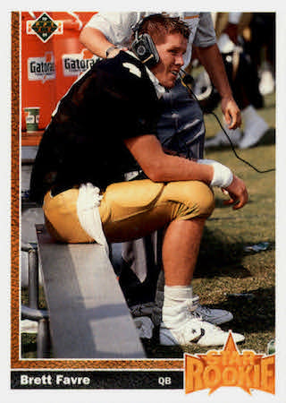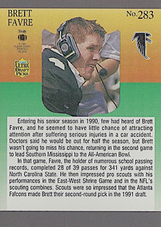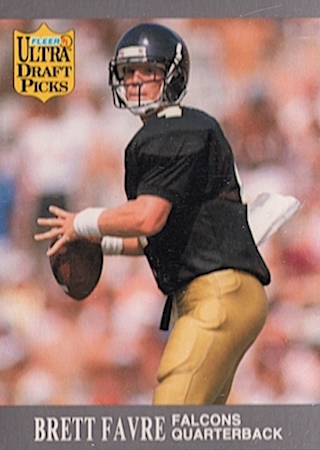 With the 33rd overall pick of the 2nd round in the 1991 NFL Draft, the Atlanta Falcons selected Brett Favre from Southern Miss University. Brett Favre has eight true rookie cards and zero parallels.