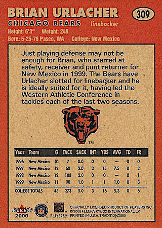 With the 9th Overall Pick in the 1st Round of the 2000 NFL Draft, the Chicago Bears selected Brian Urlacher from New Mexico University. Brian Urlacher has 49 true rookie cards and 56 parallels.