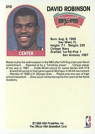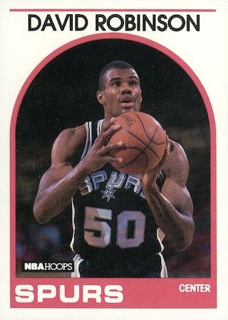 With the 1st pick in the 1st round of the 1987 NBA Draft, the San Antonio Spurs selected David Robinson from the United States Naval Academy. He has one true rookie card and one rookie year card.