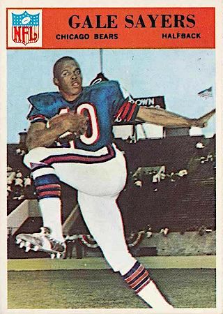 Topps back on top again produced this beautiful football card of Gale Sayers. Great photography, colors, and a banner that looks like a pill. Love it!