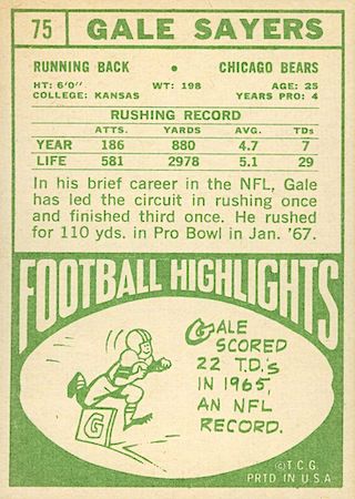 A Guess Who Quiz highlights the right side of the card back has nothing to do with Gale Sayers and takes up a lot of real estate.
