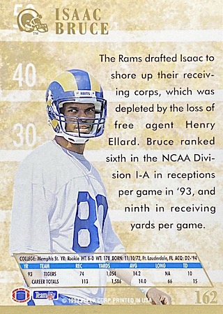 With the 33rd overall pick in the 2nd round of the 1994 NFL Draft, the Los Angeles Rams selected Isaac Bruce from Memphis State University. He has 10 true rookie cards and 4 parallels.
