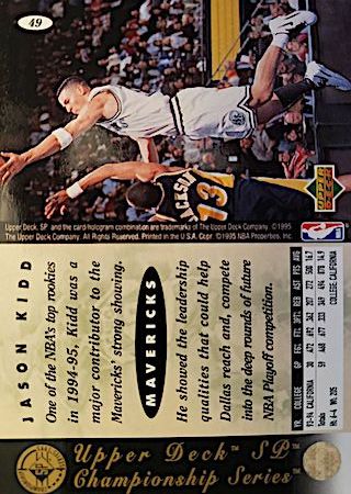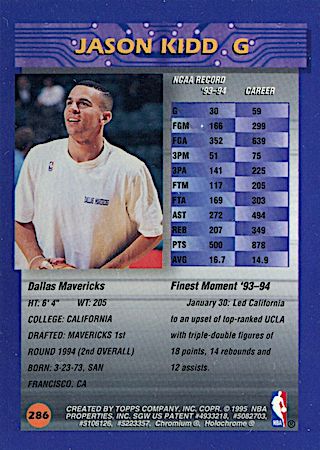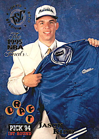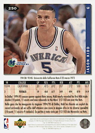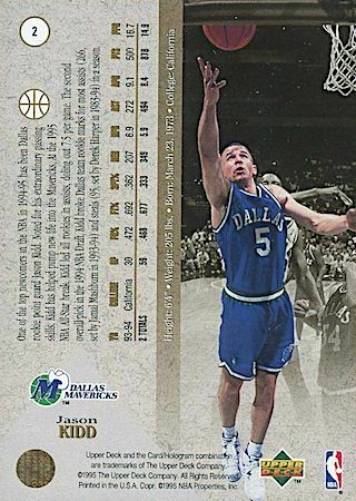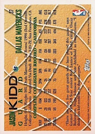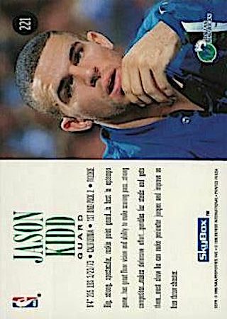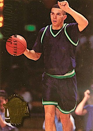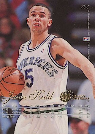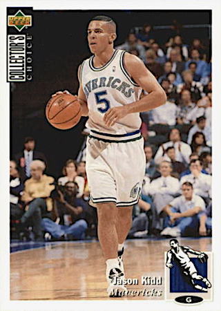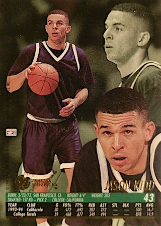 This was another budget-friendly product in 1994 but because of the thin card stock, they are prone to damaged edges and corners. Great game day action photo features Kidd in a position to block a shot. They can found in Series 2 packs and the card front has huge font letters in gold foil.