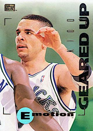 This premier set issued by Skybox was top-notch in quality, strong card stock with high gloss. The Emotion brand stamped an adjective in the front of each card identifying the featured player; Jason Kidd’s emotion has been identified as “Geared Up” as he high-fives his teammates.