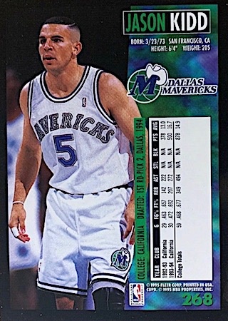 In the era of the mid-’80s to mid-90s, the Fleer basketball brand was king of the hill. Look at this great design offered to collectors. Great action photo with lots of anticipation in Jason Kidd’s body language.