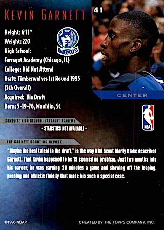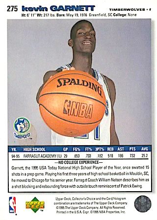 The photo shows Kevin Garnett playing defense and it sits on white borders. Gold foil lettering at the lower half of the card is well designed and it includes an NBA Draft Pick logo. The card back is well designed as well giving us everything a card back should have. There are no parallels in this set.