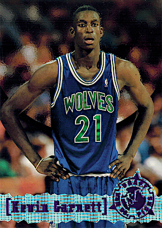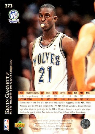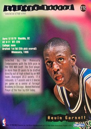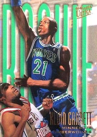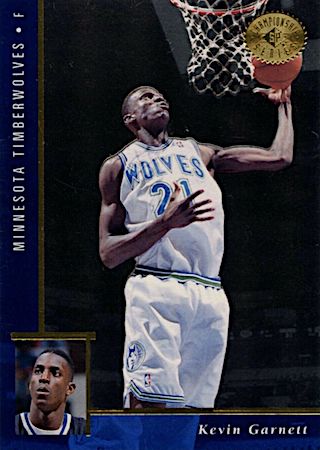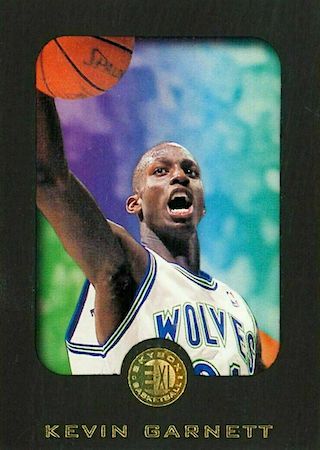 With the 5th Pick of the 1995 NBA Draft, the Minnesota Timberwolves selected Kevin Garnett from the Farragut Academy in Chicago. This NBA Hall of Famer has 15 true rookie cards with 8 rookie parallels, let’s take a look at them and his intense career.