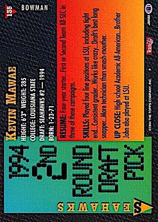 With the 36th Overall Pick in the 2nd Round of the 1994 NFL Draft, the Seattle Seahawks selected Kevin Mawae from Louisiana State University. Kevin Mawae has five true rookie cards and three parallels.