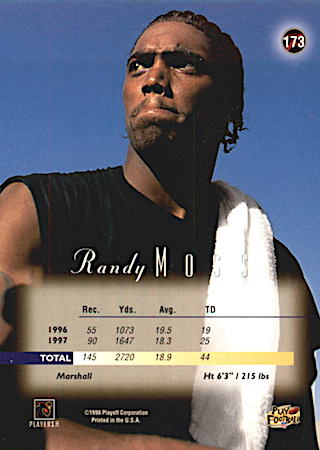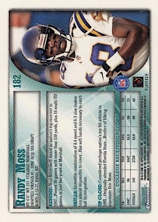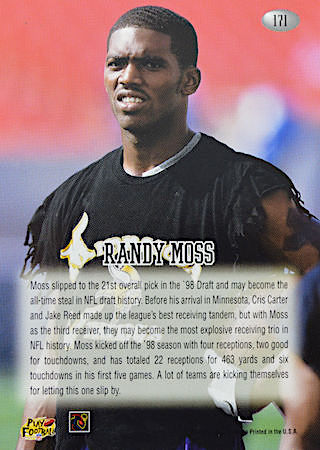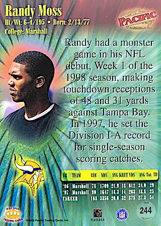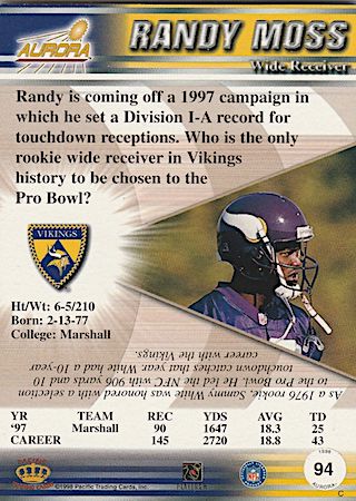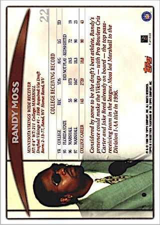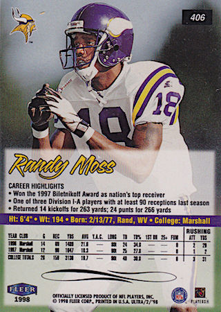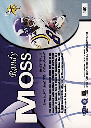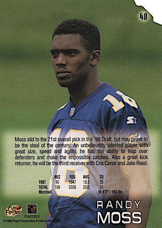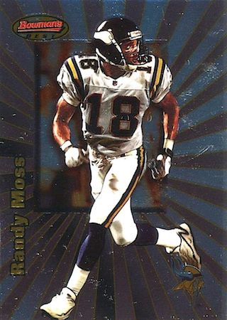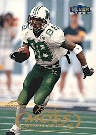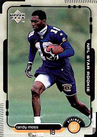 With the 21st Pick of the 1998 NFL Draft, the Minnesota Vikings selected Randy Moss from Marshall University. Randy Moss has 40 true rookie cards and 80 parallel rookie cards.