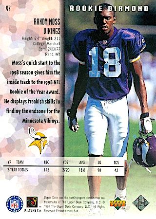 I really like this card. Borderless full action photo of Moss doing what he did best, leaping high in the air to make the catch. Card back is decent, giving collectors lots of colors and everything a card back should have.