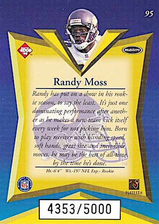 The more affordable Score brand offers collectors this rookie card of Randy Moss. I’ve always wondered what they were talking about on this card. Not a fan of the practice gear nor the photo used. The card back lacks photos and stats. Parallels include the non-serial numbered Showcase.