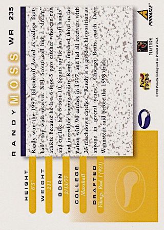 Borderless full action photo showing Randy Moss in his college uniform. I really like that football with ROOKIE stamped across it. Card back falls a bit short for me, the oversized helmet doesn’t work and player commentary, bio, and stats seem cluttered.