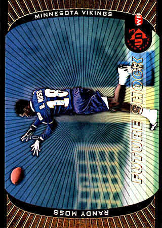 Only the truest Moss rookie card collectors would know about the Premium Fleet Farms parallel; they were inserted one per pack inside packs of Skybox Premium sold at Fleet Farm Stores, these mimic the base rookie card above but with a gold-foil FF stamped on the card front.