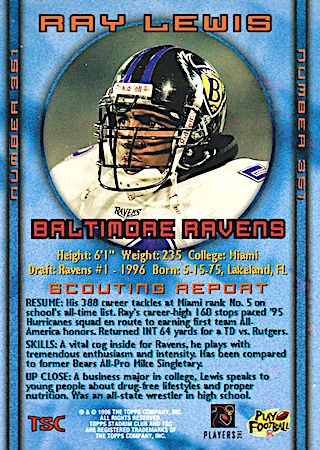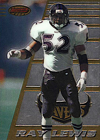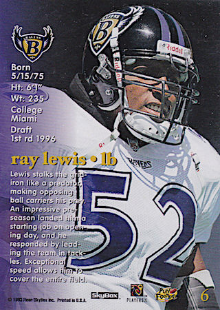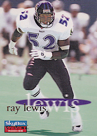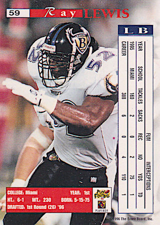 With their 2nd Pick in the 1st Round of the 1996 NFL Draft, the Baltimore Ravens selected Ray Lewis from the University of Miami. Ray Lewis has eight true rookie cards and four rookie parallel cards.
