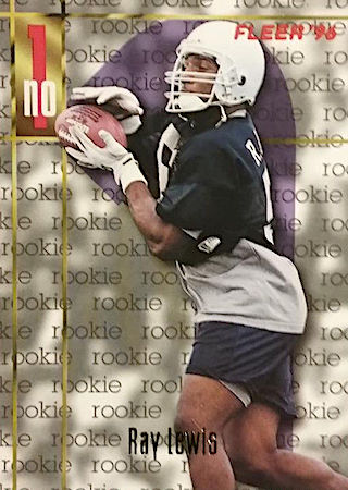 1996 Fleer Football is a single series 200 card set. It was printed on very thin card board stock. It features a Ray Lewis rookie card in a practice uniform with no logos, not a collector favorite. However, it is still a true rookie card of a hall of famer. There are no parallels for this set.