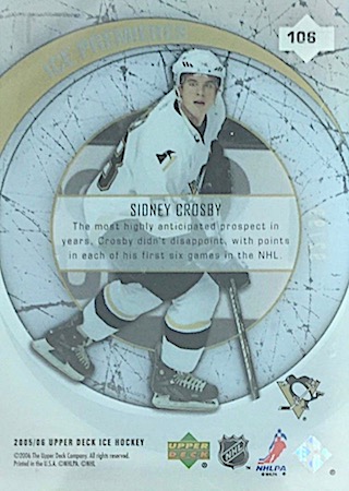 Upper Deck offers a lot of foil on the card front. Decent design and #’d/999. Card back says Sidney Crosby is, “Considered a can’t miss NHL superstar.” They called that one correctly. No parallels to speak of with this one.
