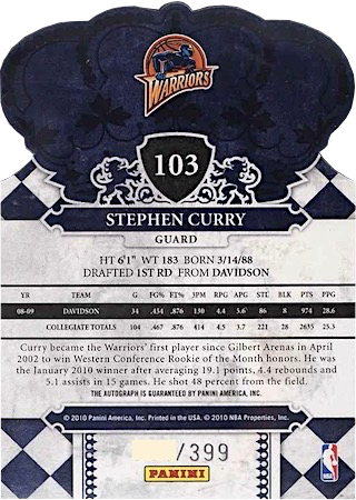 The popular Upper Deck brand offers collectors an affordable, respectable Steph Curry rookie card. The design front and back to me is excellent. Its only flaw, in my opinion, is the college uniform. Nothing fancy just a very traditional rookie card with no parallels to offer.