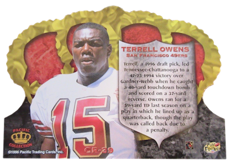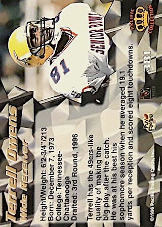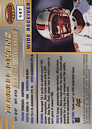 More of the same on the card back and it gives collectors extended statistical information. This high-end product was an absolute hit with collectors! There are no parallels in this set. This is the most desired Terrell Owens rookie card among collectors, and the most valuable.