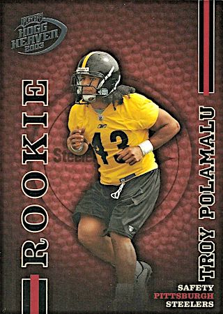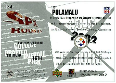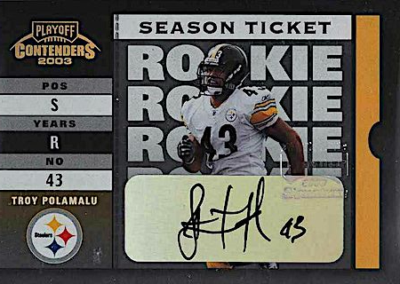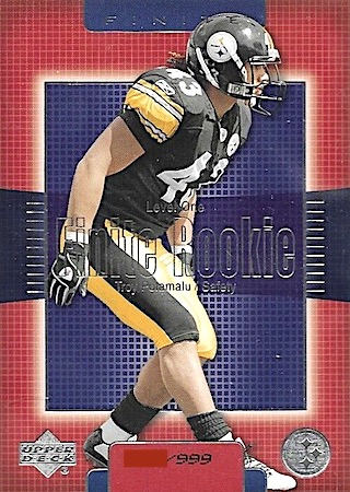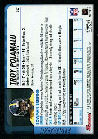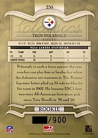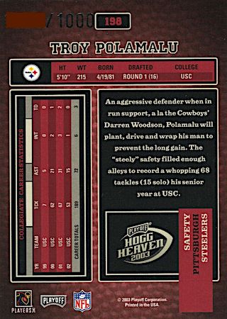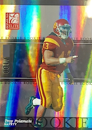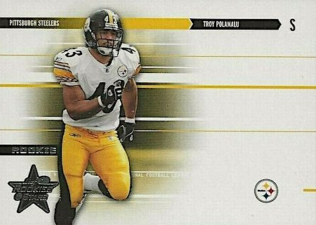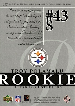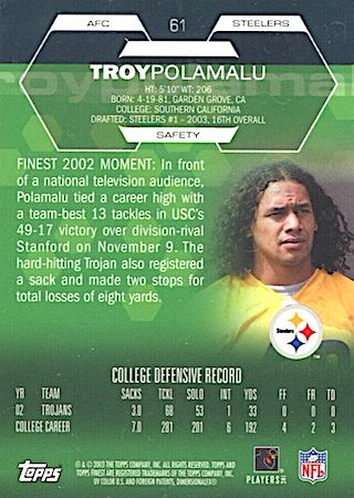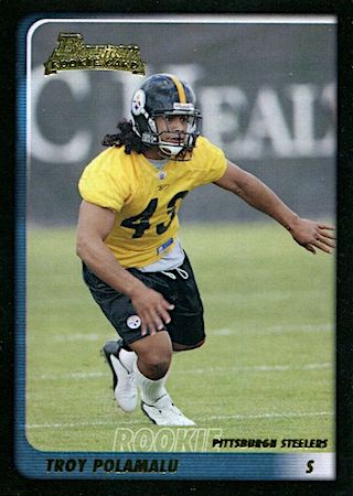 With the 16th overall pick in the 1st Round of the 2003 NFL Draft, the Pittsburg Steelers selected Troy Polamalu from the University of Southern California. Troy has 19 true rookie cards along with 30 rookie parallel cards.
